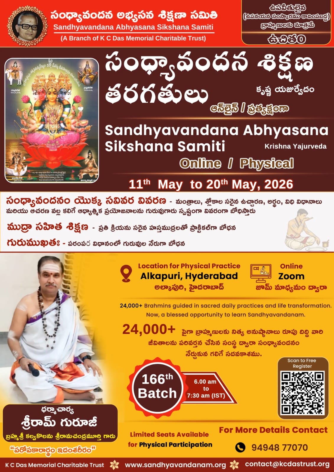 Brahmasri Samavedam Shanmukha Sharma garu applauding Sandhyavandana Abhyasana Sikshana Samithi a branch of K C Das Memorial Charitable Trust and mentioning training at Malkajgiri, Hyderabad.